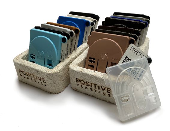 The sets have bio-based plastics, post-consumer recycled plastics, post-industrial recycled plastics, bio-composites, and mass balanced plastics from leading manufacturers.Each sample has an attached information card with a QR code that links to a website with comprehensive information about the material and supplier contact information.